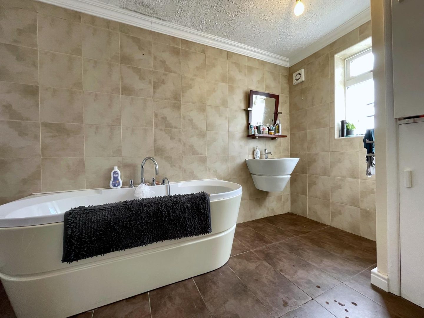 Fully tiled white suite comprising of a panelled bath chrome mixer tap over and chrome shower attachment, floating wash hand basin with chrome mixer tap and low level wc. Ceramic tiled flooring, ceiling coving, radiator, storage cupboard housing the gas central heating boiler and two uPVC double glazed windows to the side and rear.