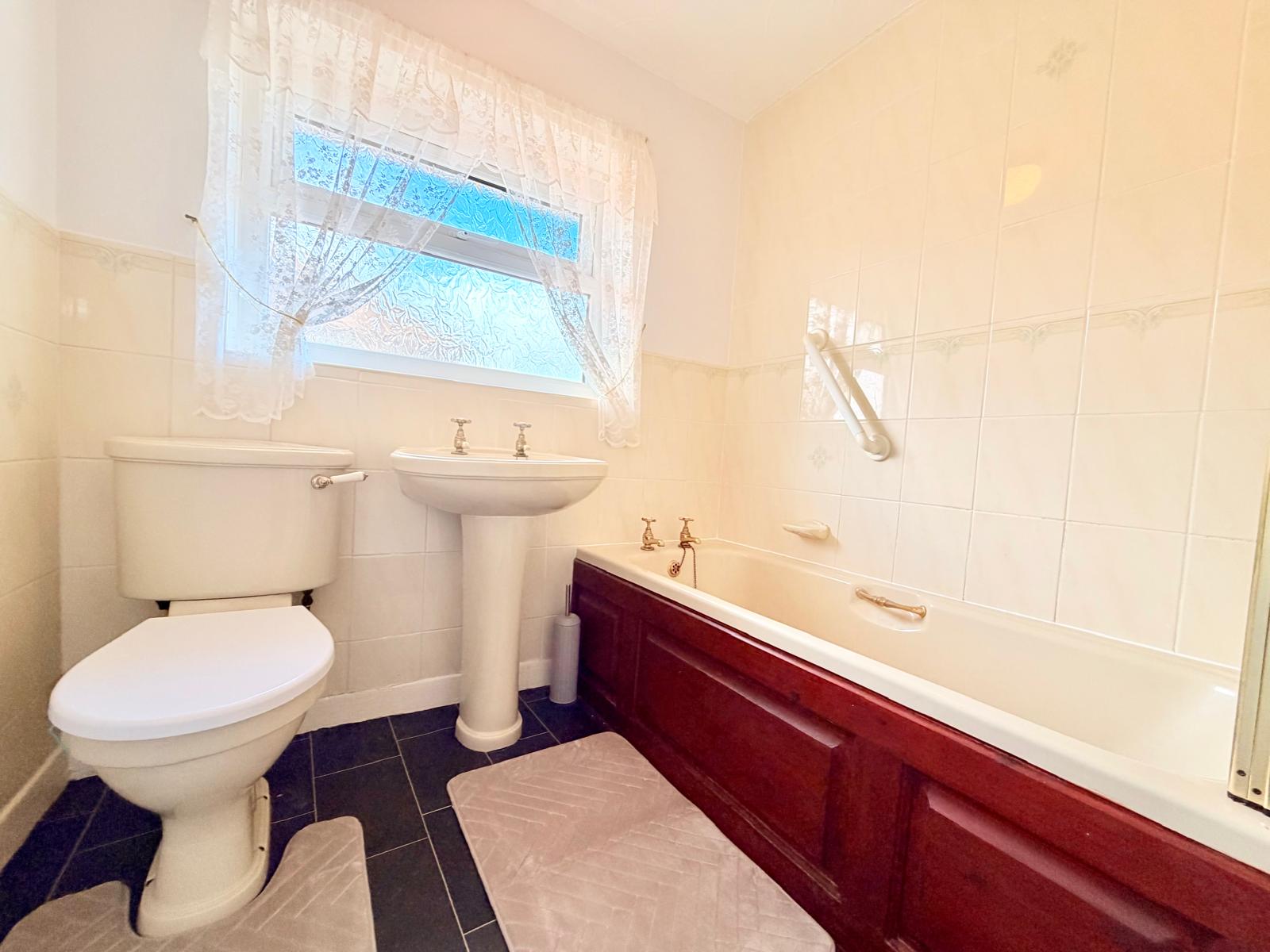A white three piece suite with a mahogany-panelled bath, low level wc, wash hand basin, uPVC window to side aspect, radiator, three-quarter tiled decor and tile-effect vinyl flooring.