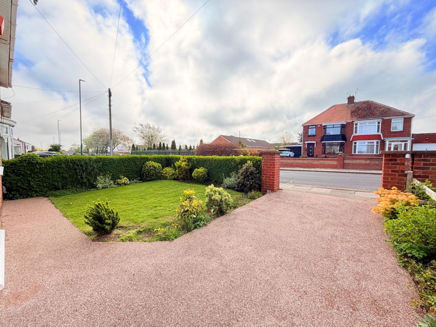 Dwarf retaining brick wall enclosed a lawned front garden with borders. Resin side drive and pathway leading to property and access to side driveway and rear garden.