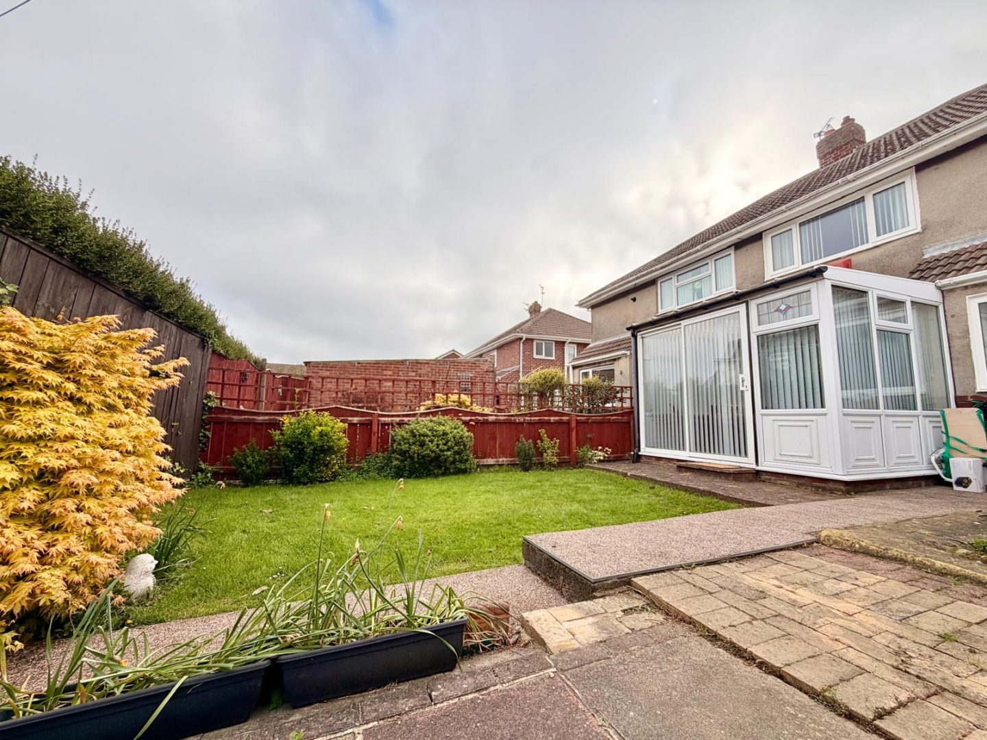 Fence enclosed rear garden laid mainly to lawn with borders, patio area, pathway to side leading to rear of garage, gate access to side.