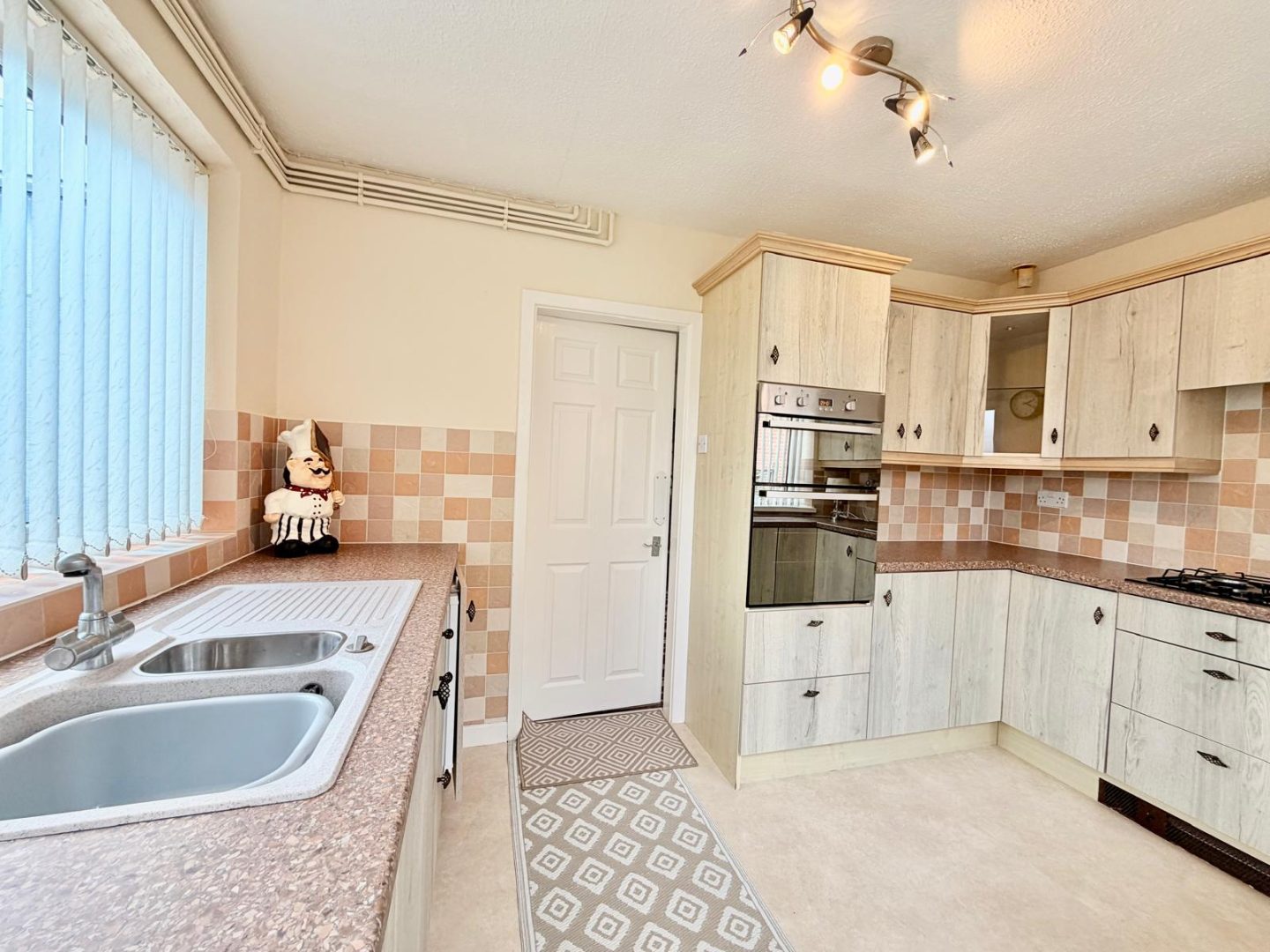 Fully fitted with a range of matching washed Oak fronted wall and base units incorporatingroll top work surfaces with matching tiled splashbacks, 1 1/2 bowl drainer sink unit with a mixer tap, plumbing for an automatic washing machine, built in 4 ring gas hob, fan assisted eye level Hotpoint double oven, overhead extractor, integrated fridge, uPVC window to side and rear aspects, uPVC rear access door from driveway.