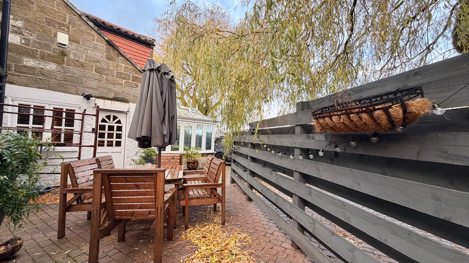 Externally, the property stands on a generous plot. To the front is an elevated lawned garden enclosed by stone walling and hedging, with mature planting. Double gates to the side open to a block-paved driveway and two private rear parking spaces. Beyond these lies the enclosed rear garden, featuring a lawn with mature shrubs, ornamental willow and holly trees, and ample storage. A secluded block-paved courtyard sits to the side of the property, providing a sheltered outdoor seating area.