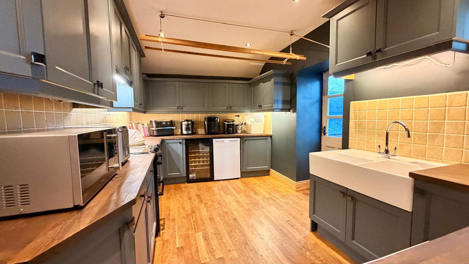 Again fitted with high quality Treske matching anthracite wooden units including incorporating a twin bowl Villeroy and Boch white glazed Butler sink with mixer tap, tiled splashbacks, floor and wall cupboard units with beech working surfaces, gas cooker point, plumbing for automatic washing machine, space for dryer, eyeball spot lighting, gas central heating boiler, pull down Sheila Made clothes airer, a feature natural dressed stone wall, engineered Oak finish flooring and external access door to rear.