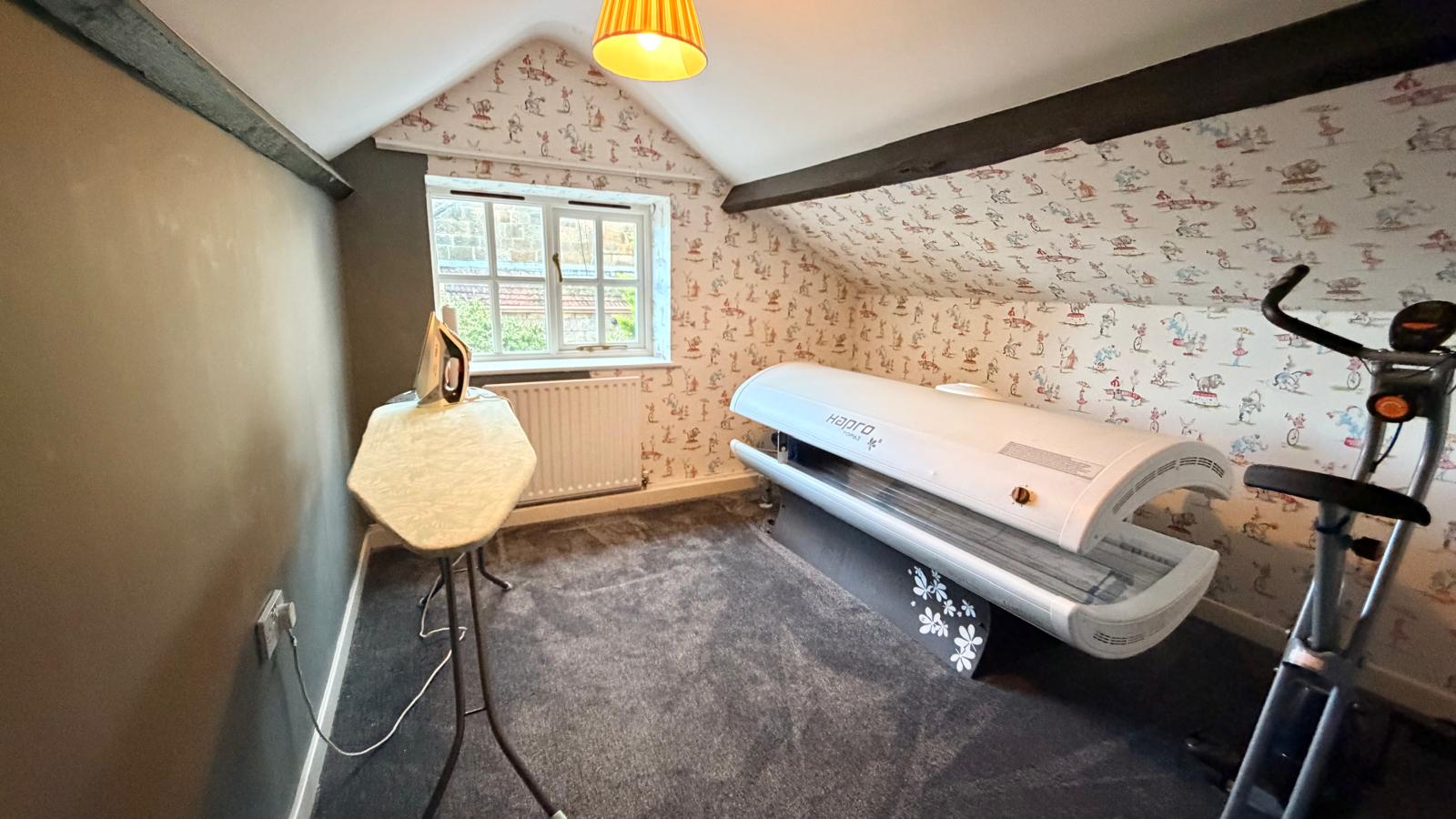 With radiator, beamed ceiling, single wall lights, window to rear aspect.
