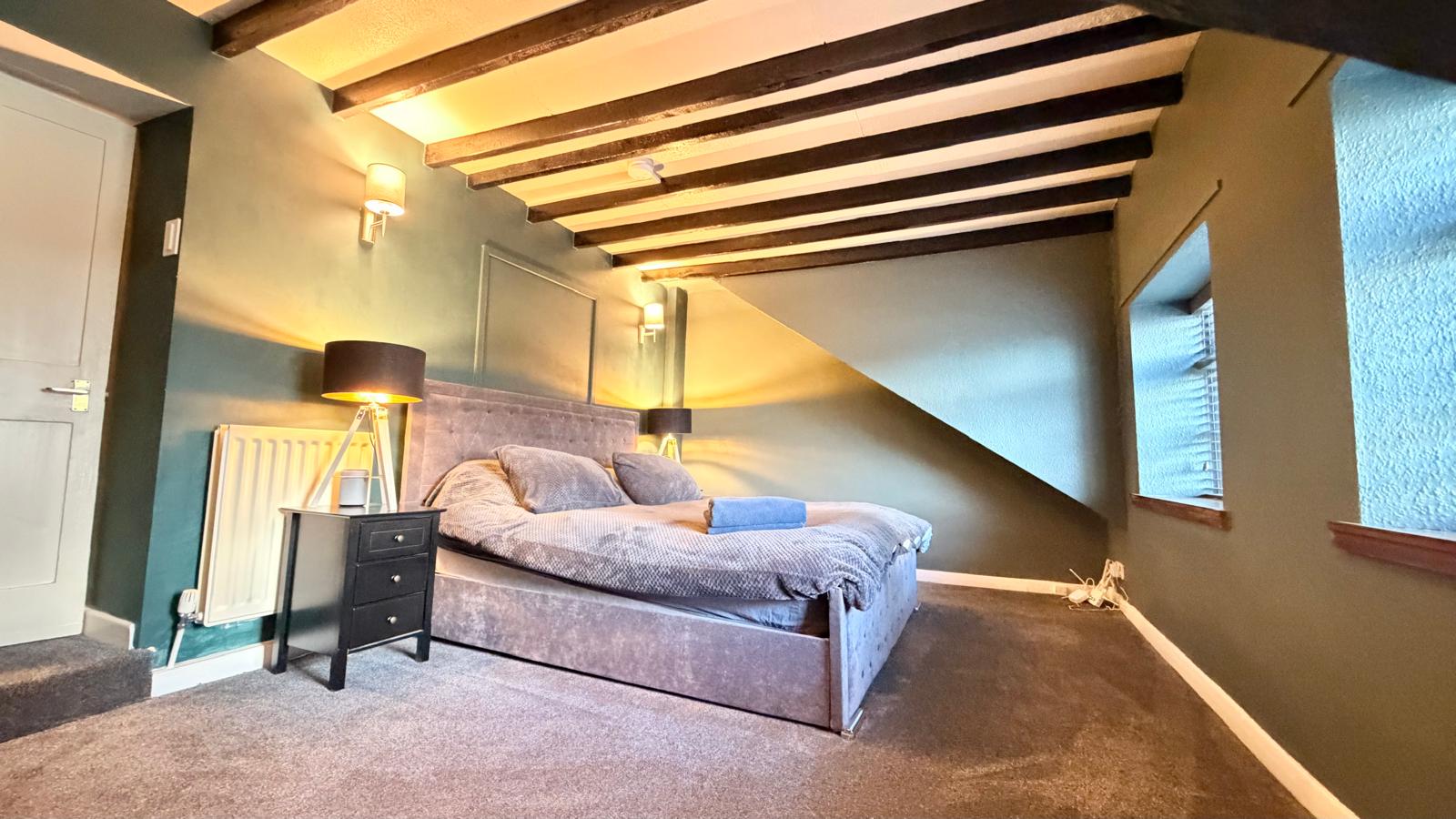 With radiator, beamed ceiling, single wall lights, window to front aspect with traditional wooden shutters and access door through to the nursery bedroom.