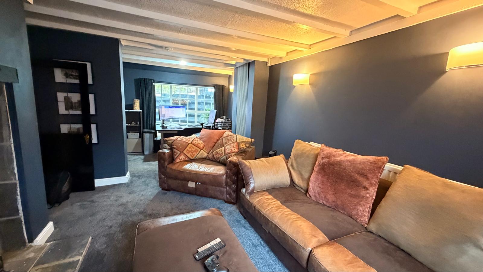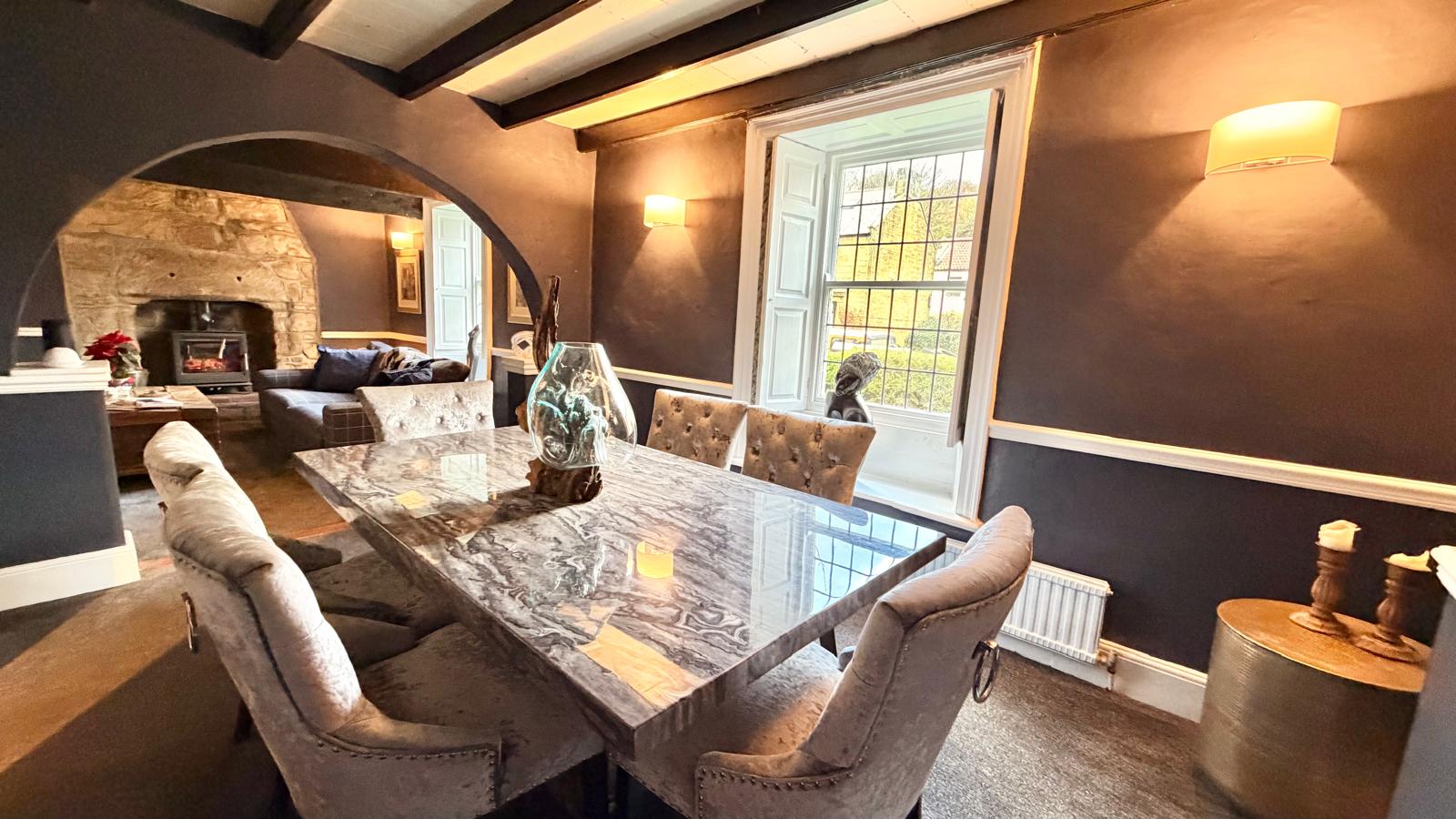 Beyond the lounge and having a traditional beamed ceiling and both front and rear aspect windows (the rear being a larger bow style) with dressed stone Inglenook fireplace and single wall lights.