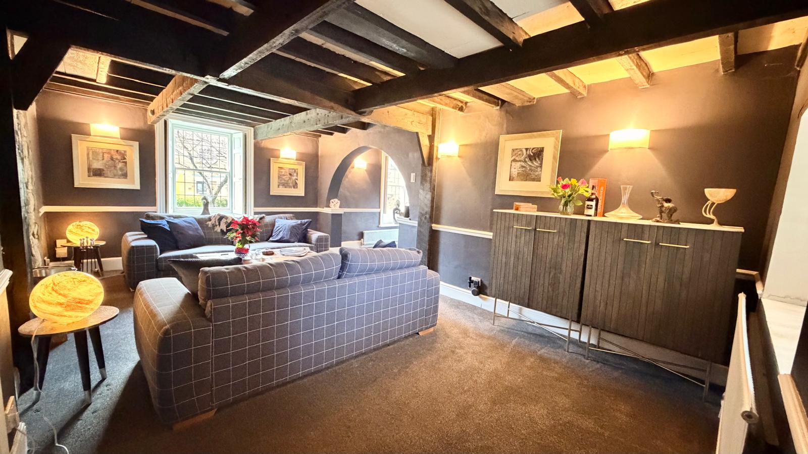 From the main hallway, access through into an impressive L-shaped living and dining room, featuring original ceiling beams, a large dressed-stone fireplace with multi-fuel stove and double-glazed windows with period wooden shutters that offer soft, atmospheric light. A further sitting room and office—complete with an Inglenook fireplace and a bow window overlooking the garden - provide additional versatile space on the ground floor.