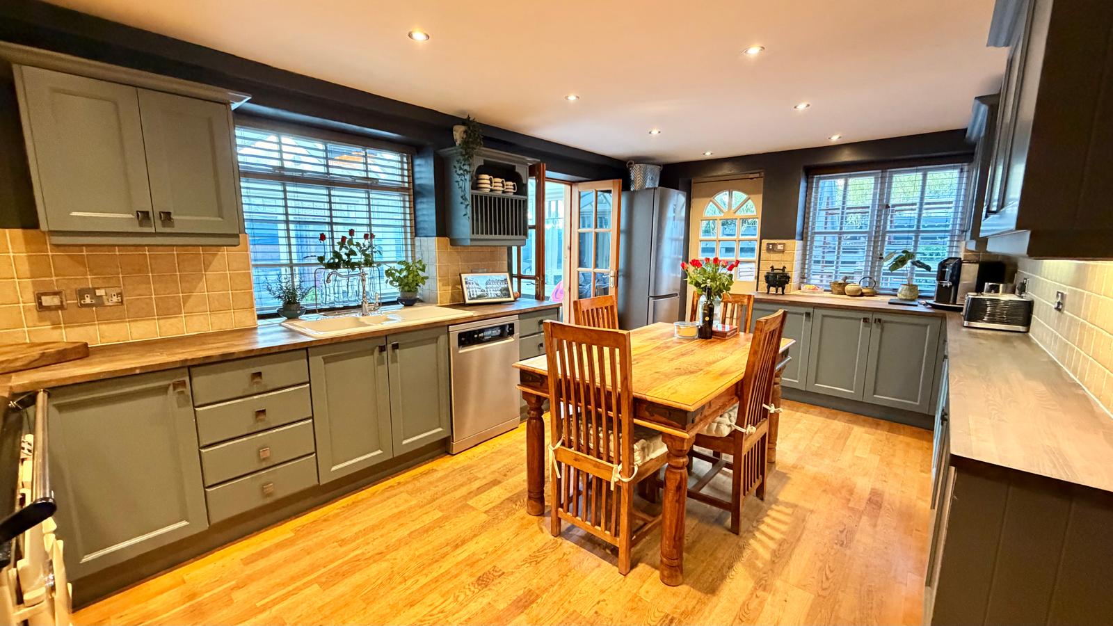 Fitted with a modern range of anthracite grey painted wooden fronted Treske floor and wall cupboard units with cabinetry and shelving, solid Beech working surfaces and tiled splashbacks, Villeroy and Boch white inset sink with mixer tap, under counter complimentary lighting, engineered Oak finish flooring, cream Aga stove, dishwasher point, space for central family dining table, Georgian window to rear aspect, window to side aspect, external access door and twin doors leading to the conservatory.