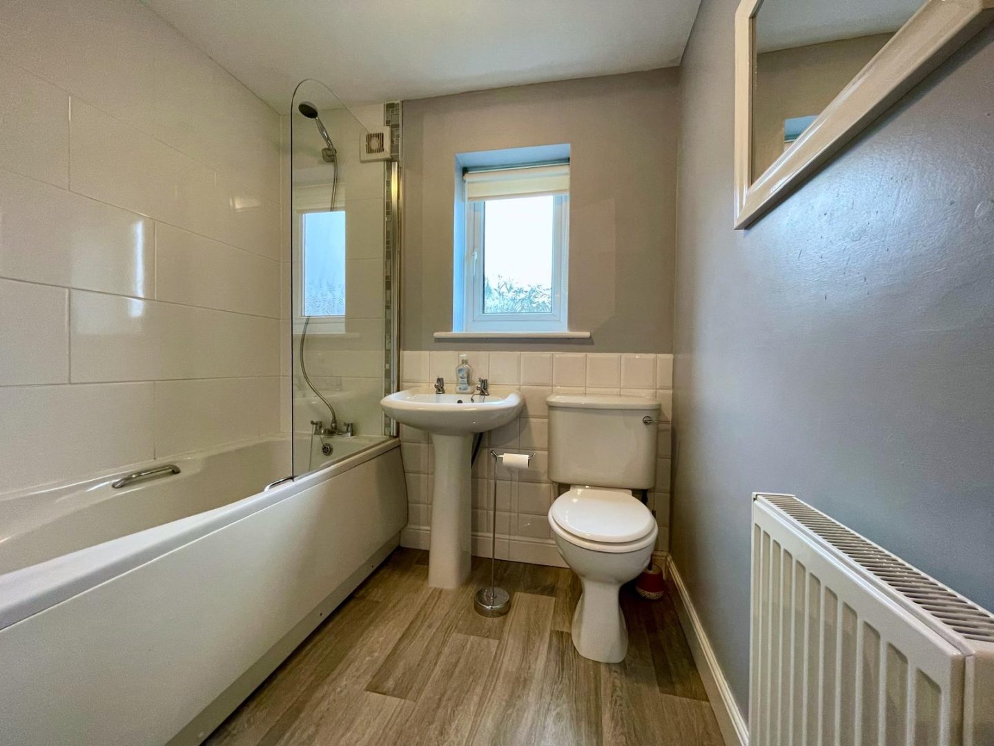 Three piece white suite comprising of a panel bath with mixer tap, pedestal wash hand basin and low level wc. Tiled splashback, vinyl flooring, radiator and uPVC double glazed window to side.