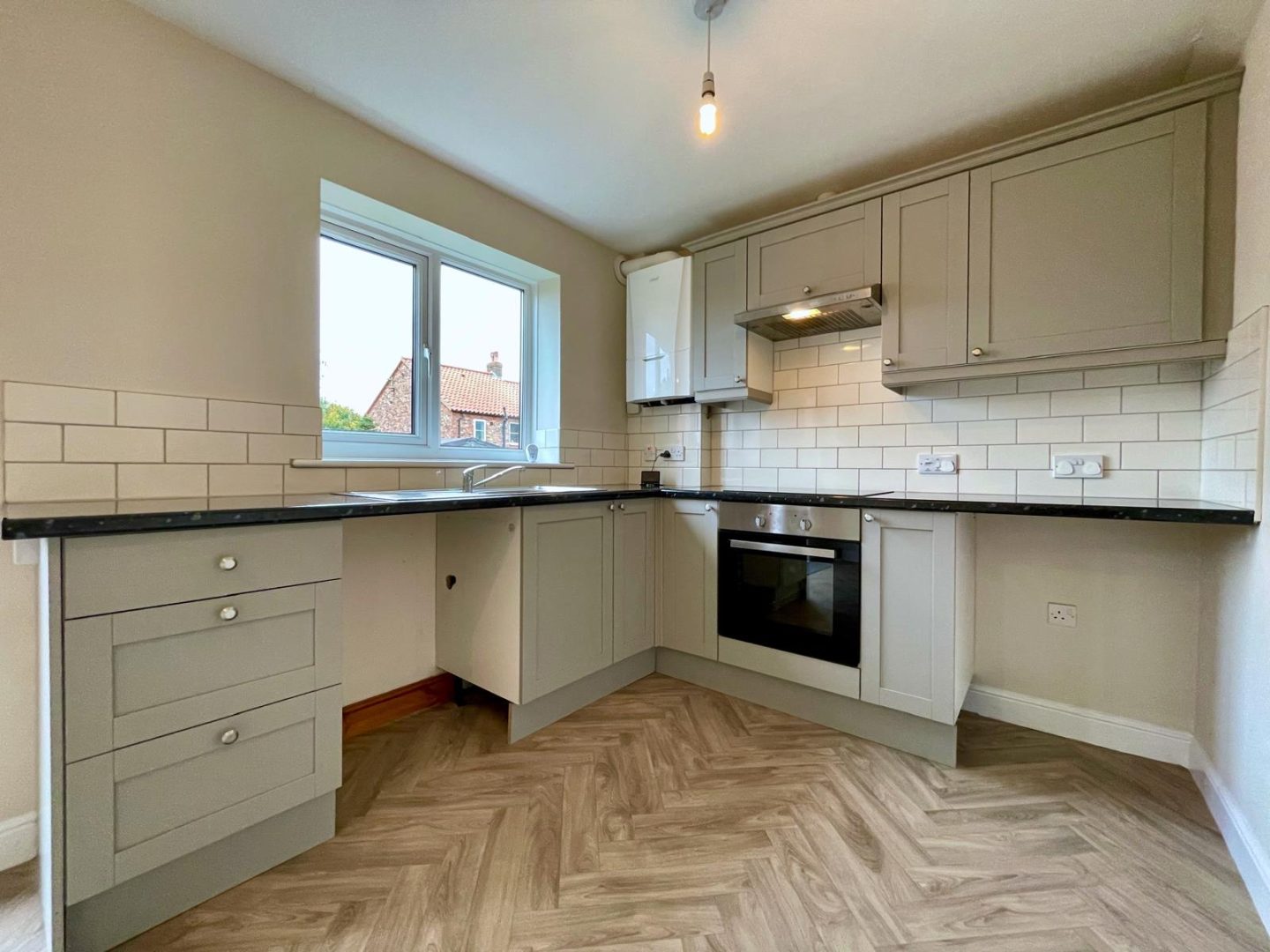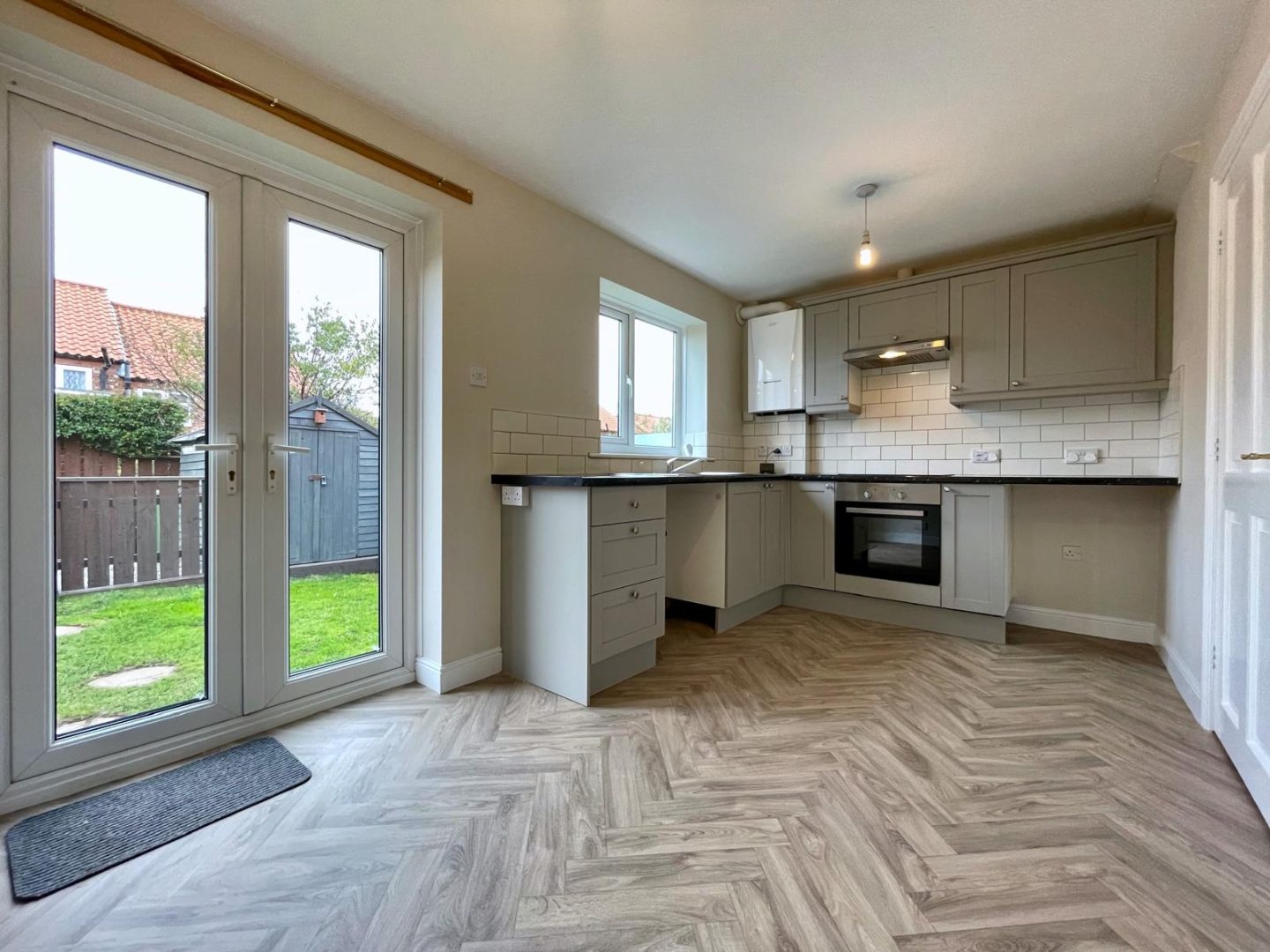 uPVC double glazed window to rear and uPVC French doors opening out to the rear garden. Fitted with a good range of grey wall and base units incorporating rolltop marble effect working surfaces and tiled splashbacks. Stainless steel sink unit with mixer tap, fan assisted electric oven with touch screen hob and cooker hood over, plumbing for an automatic washing machine and space for a fridge freezer. Wall-mounted gas central heating boiler, parquet effect vinyl flooring and radiator.