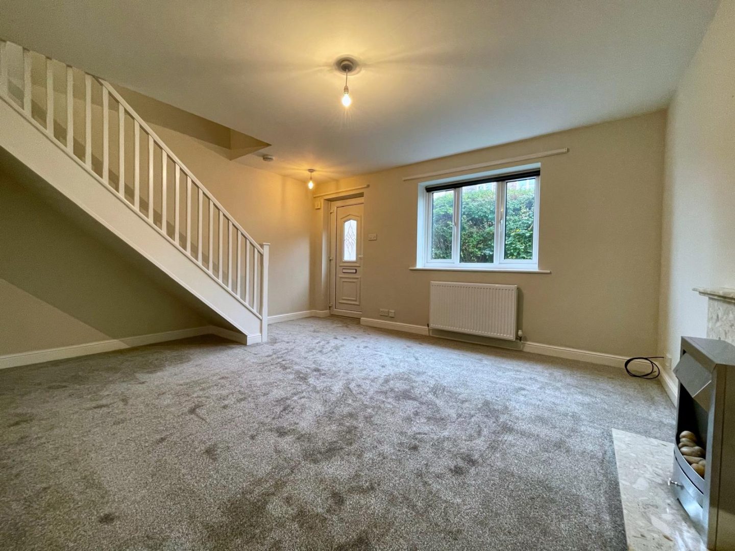 uPVC entrance door to front, uPVC double glazed window to front, staircase to the first floor and marble fire surround housing an electric flicker flame fire.