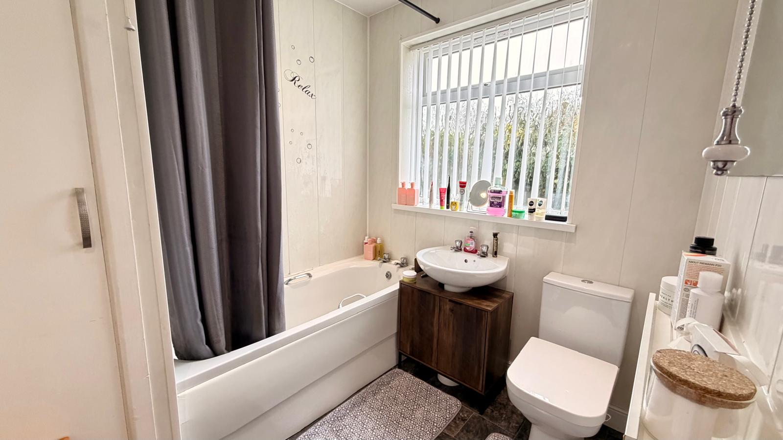 PVC-clad bathroom comprising a panelled bath, pedestal wash hand basin and low-level wc. Features include vinyl flooring, storage cupboard, ceiling spotlights, radiator and uPVC double-glazed window to the side aspect.