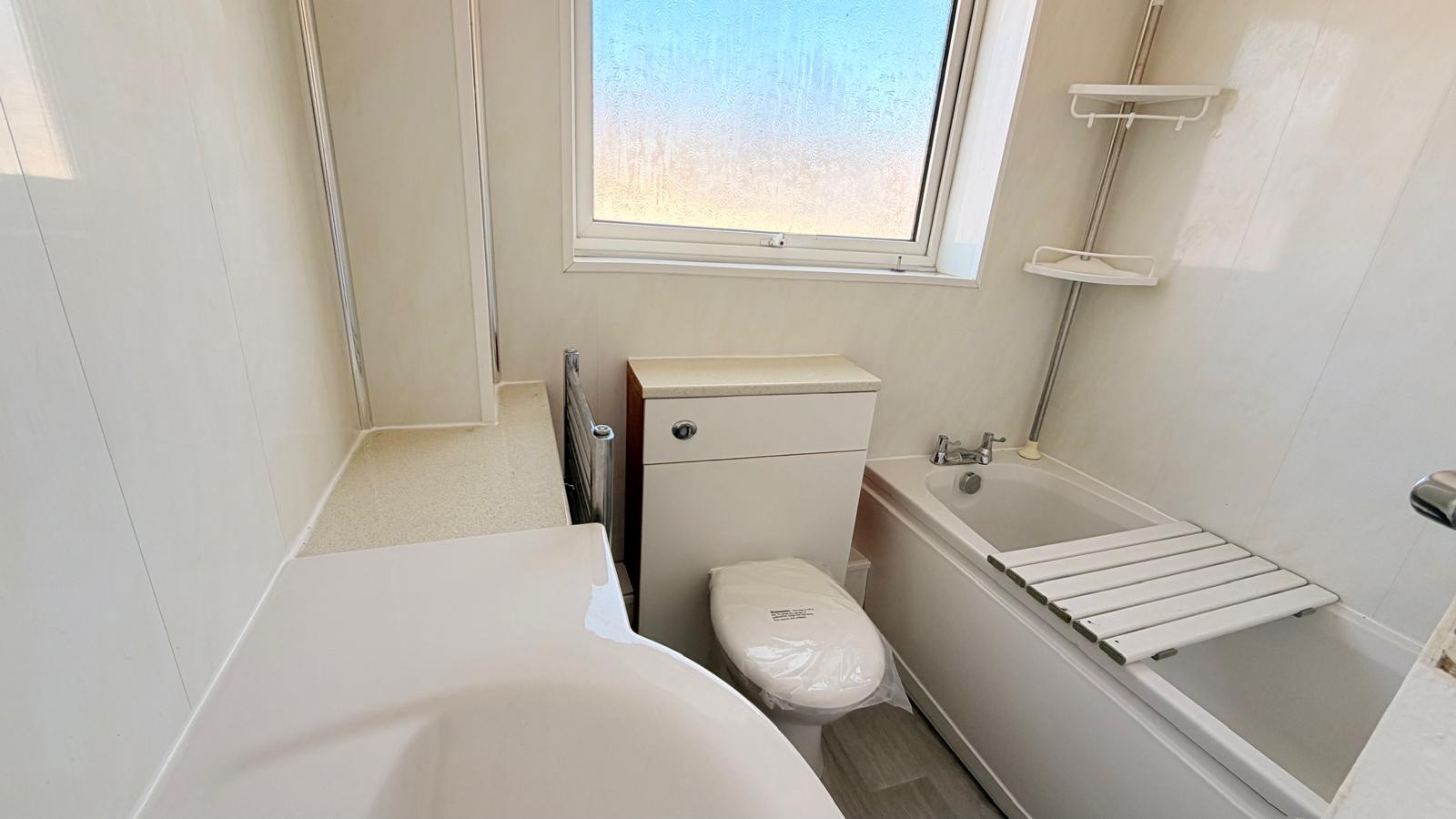 Modern white suite comprising: distinctive and stylish sink unit with mixer tap and shelving below, dual flush wc and panel bath with mixer tap and shower over, chrome effect heated towel rail / radiator, fashionable PVC clad walls and co-ordinating PVC clad ceiling, uPVC double glazed window to the rear.