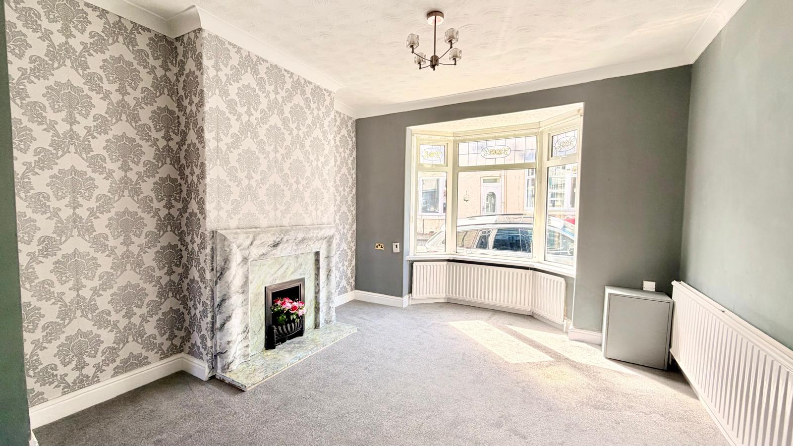 uPVC double glazed bay window to the front with a shaped radiator below, modern marble effect fireplace, and ceiling coving. Open to the dining room.