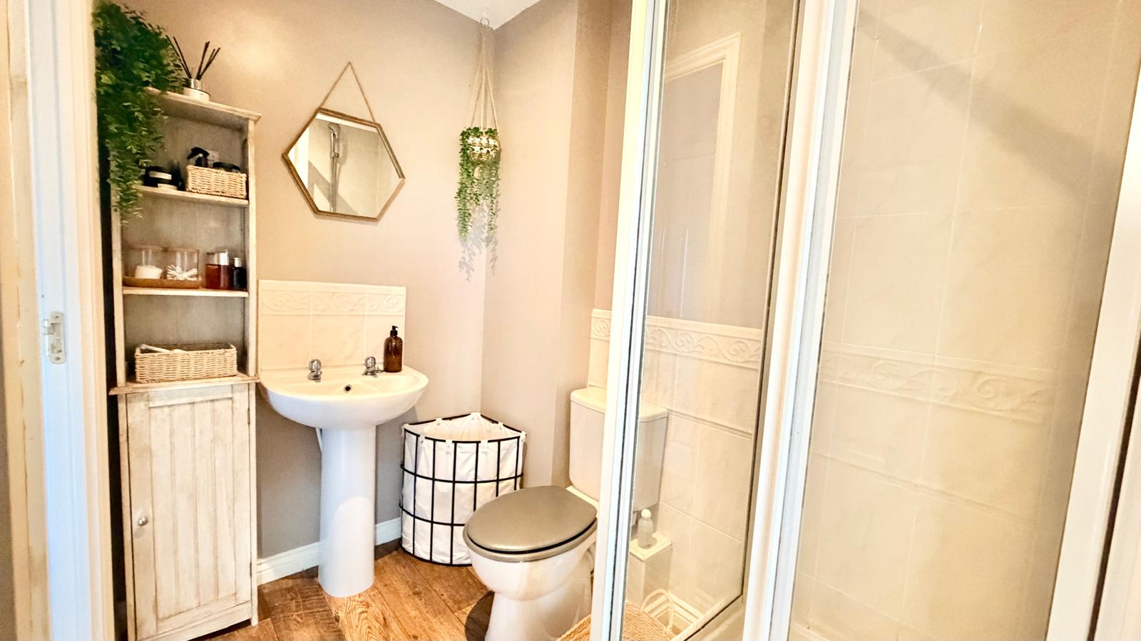 En-Suite dual accessible Shower Room    2.07m x 1.67m (6'9" x 5'5") With access doors from both the bedroom and landing this white suite comprising; pedestal wash hand basin, dual flush wc, corner offset quadrant glazed shower cubicle with overhead shower within a low profile tray,  radiator, laminate flooring, extractor fan.