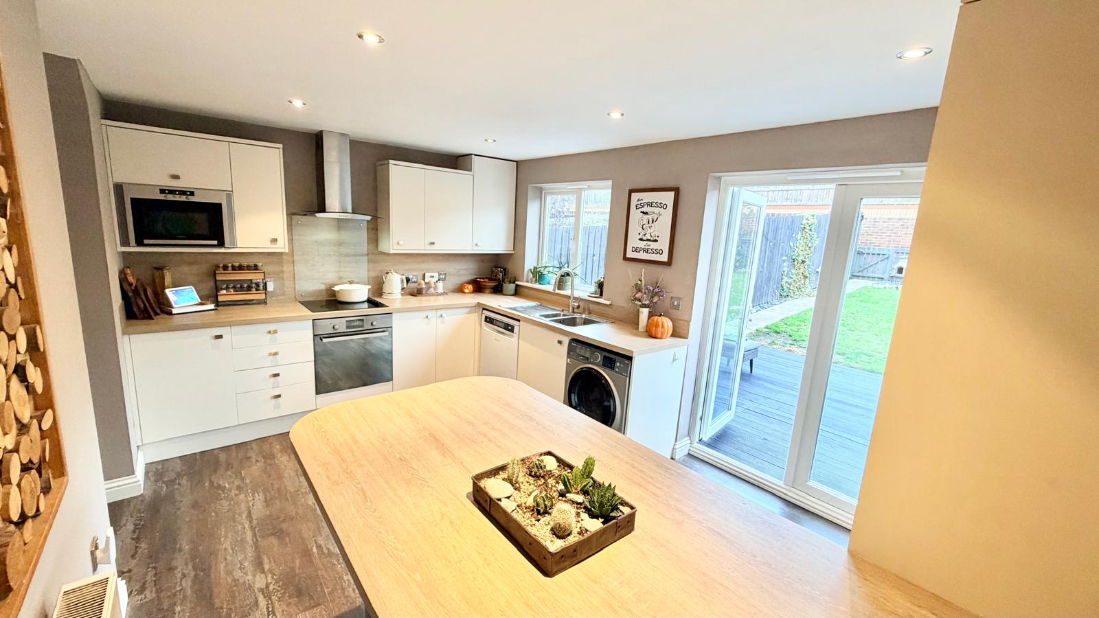 Open plan rear Dining Kitchen    4.55m x 3.06m (14'11" x 10'0")Offering a delightful, modern setting and an ideal place to entertain family and friends with a uPVC window to rear and uPVC French doors opening out into the rear garden, comprehensively fitted with a modern range of cream wall, base and drawer units, Oak effect laminate worktops and matching upstand, plumbing for washing machine and dishwasher point, one and a half bowl Stainless Steel sink with drainer and mixer tap, integrated fan assisted electric oven and induction hob, integrated microwave, Stainless steel hood and extractor fan, LED downlights, radiator, wall mounted gas Combi central heating boiler set within a concealed cupboard, breakfast bar area and several white goods appliances can be left by the current owners, subject to negotiation and which may include; a dishwasher, washer/dryer and fridge freezer.