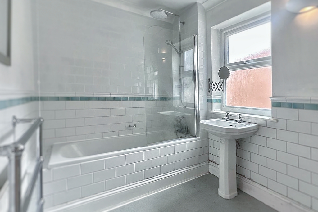 Fully tiled with Metro tiling in white, offering a white Period three piece suite with low level wc, pedestal wash hand basin, panelled bath, window to side aspect, radiator and vinyl flooring.