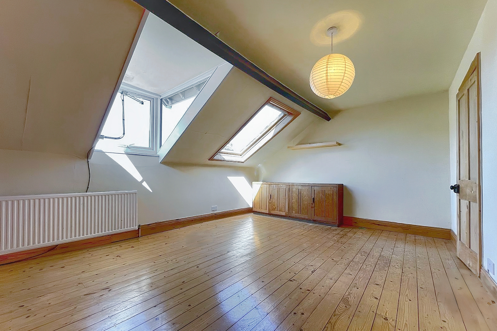 uPVC sealed unit double glazed box bay window to front aspect with further Velux window, radiator and cast iron fireplace.