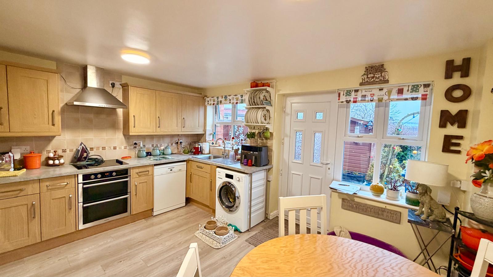 Fitted with a matching range of Oak fronted wall and base units with laminate work surfaces, sink unit with mixer tap, integrated double oven with four ring electric hob and extractor hood over, laminate flooring, radiator, uPVC windows to side and rear aspect entrance door, plumbing for washer, space for dining table and uPVC window to rear aspect.