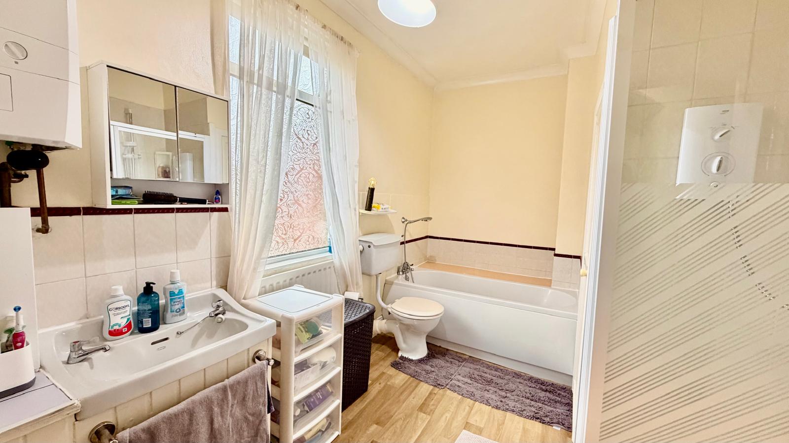 A spacious bathroom with panelled bath, low level wc, wash hand basin, walk in separate glazed shower cubicle with shower over, uPVC window to the rear aspect, tiled splashbacks, vinyl flooring and wall mounted Logic central heating boiler.