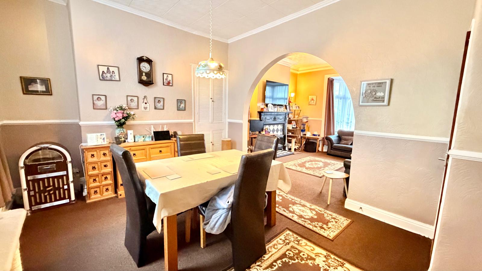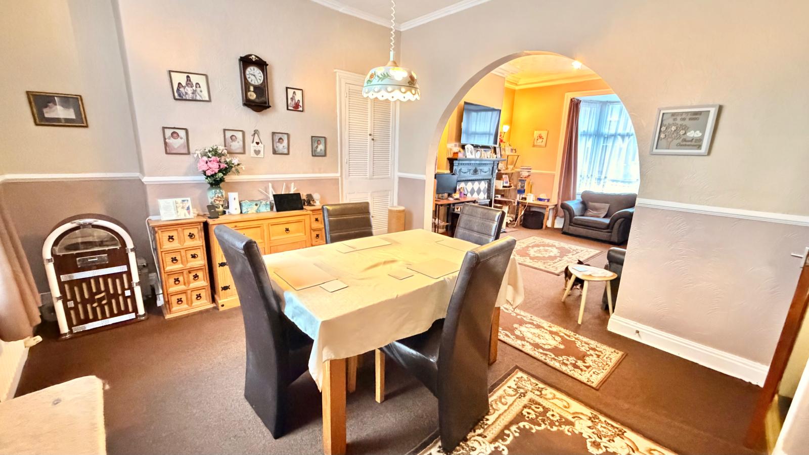 uPVC double glazed bay window to the front aspect, feature Antique style fire surround incorporating a black & white tiled backdrop and hearth with electric stove fire, TV aerial point, original coved ceiling & centre rose, radiator and opening through to:-