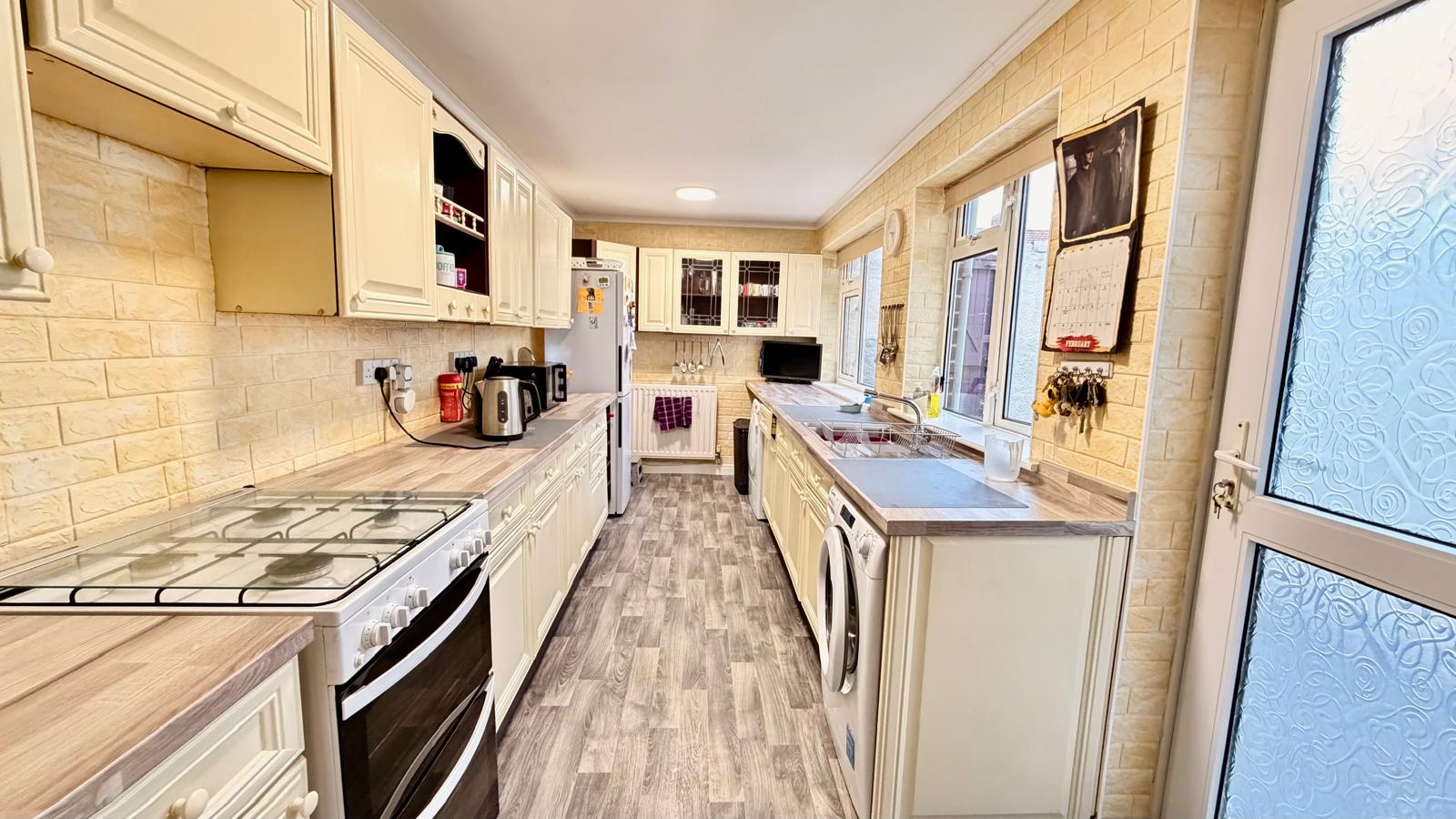 Two uPVC double glazed windows to the side aspect, fitted with a matching range of cream wall & base units with laminate work surfaces, brick slip splashbacks, sink unit with mixer tap, gas cooker point, under-stairs pantry recess cupboard, plumbing for washer, vinyl flooring, radiator and double glazed door to rear yard.