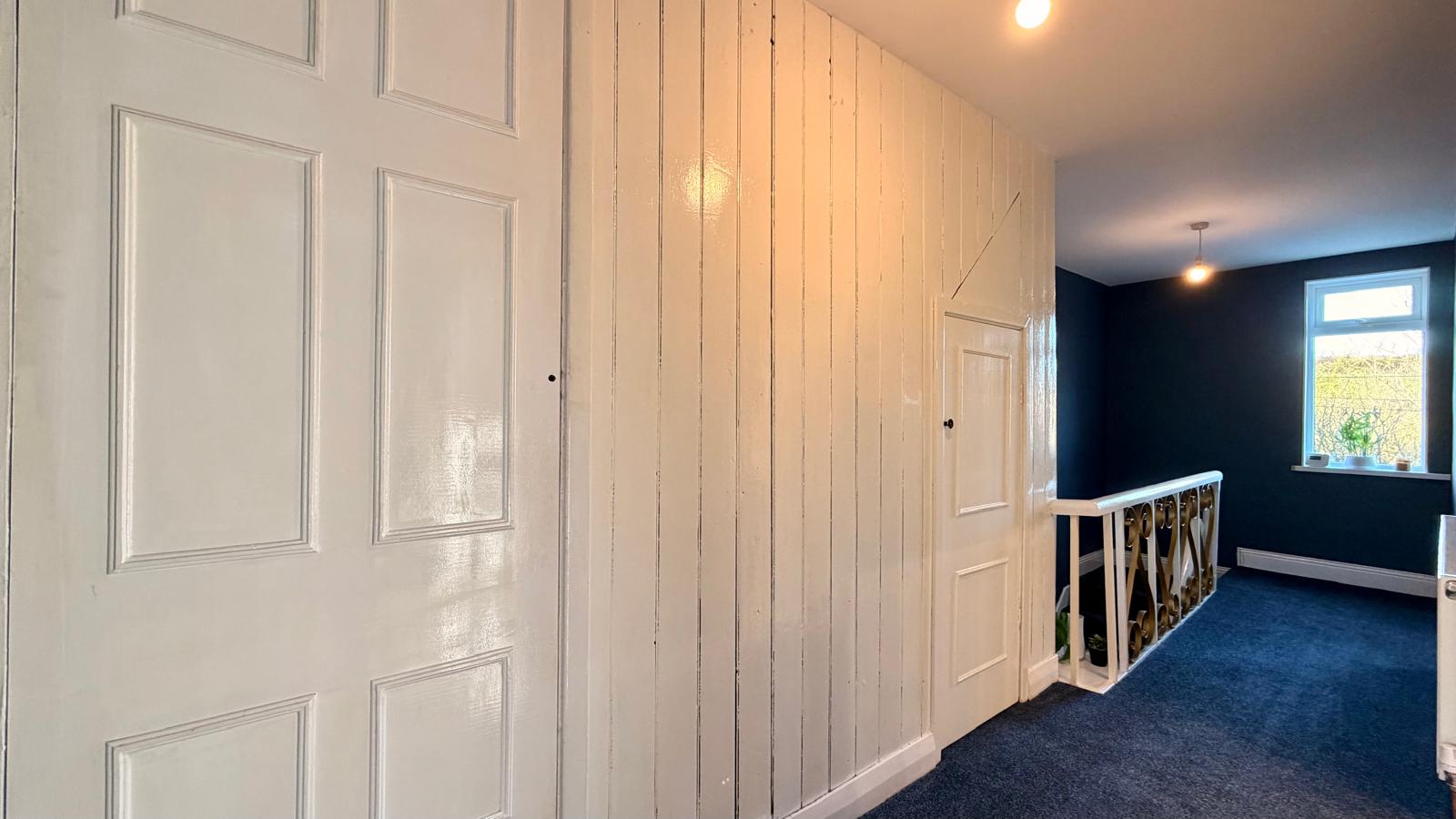 Light and airy landing painted in traditional colours with a window to the rear aspect, built-in deep storage cupboard and door having staircase leading up to the second floor level.