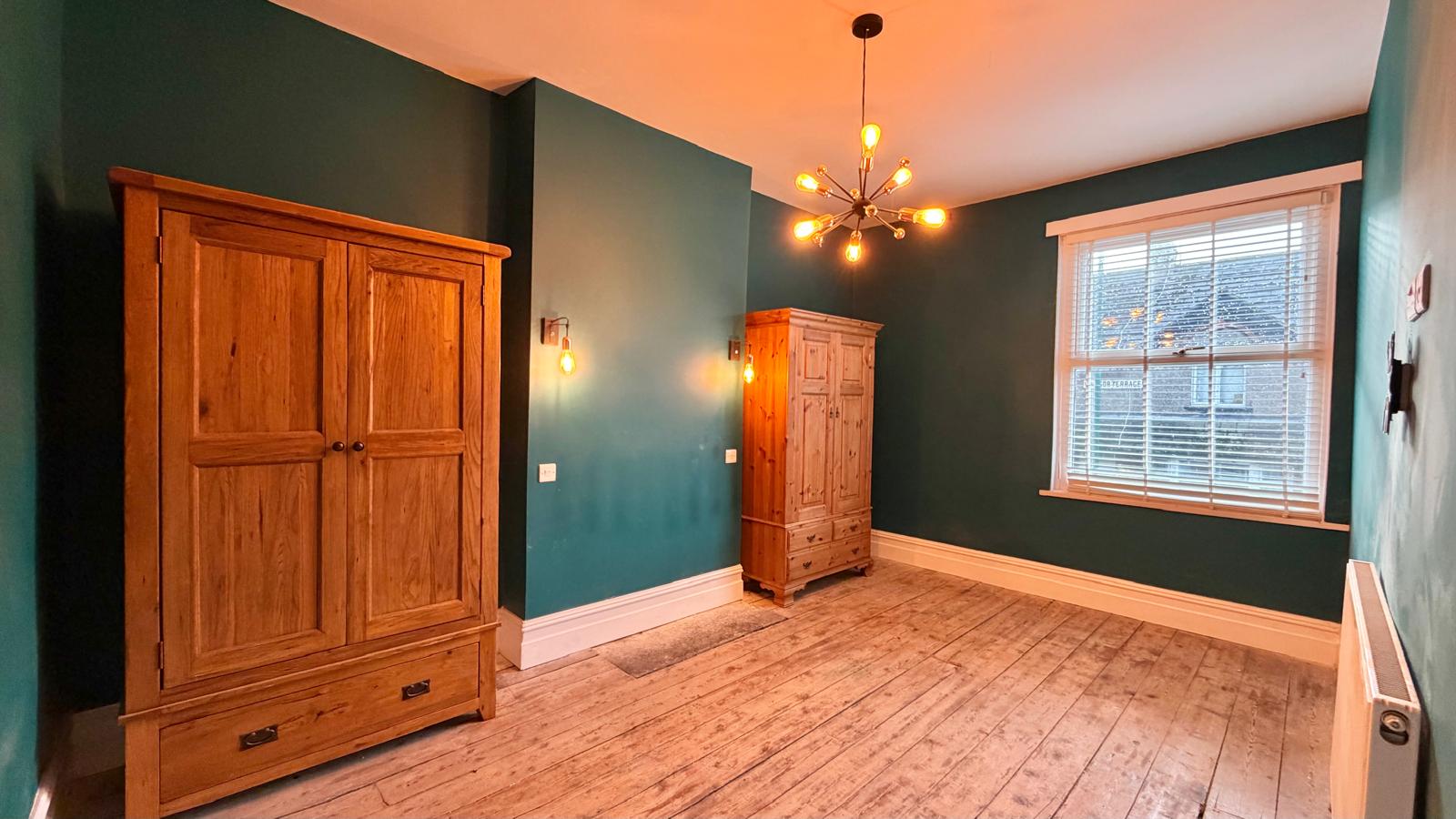 Spacious bedroom with window to the front aspect, industrial style wall lights, stripped original floor boards and radiator.