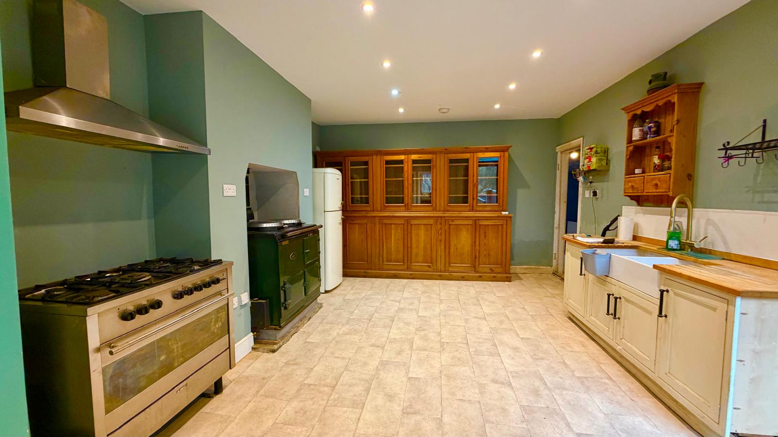 A fabulously sized family room with ample room for entertaining having traditional base units with a bespoke full length pine dressing unit with cupboards and storage, ample space for a centre preparation island, Inglenook fireplace recess with Aga stove, vinyl flooring, Bi-folding doors leading out into the rear courtyard, under stairs pantry cupboard, opening through to:-