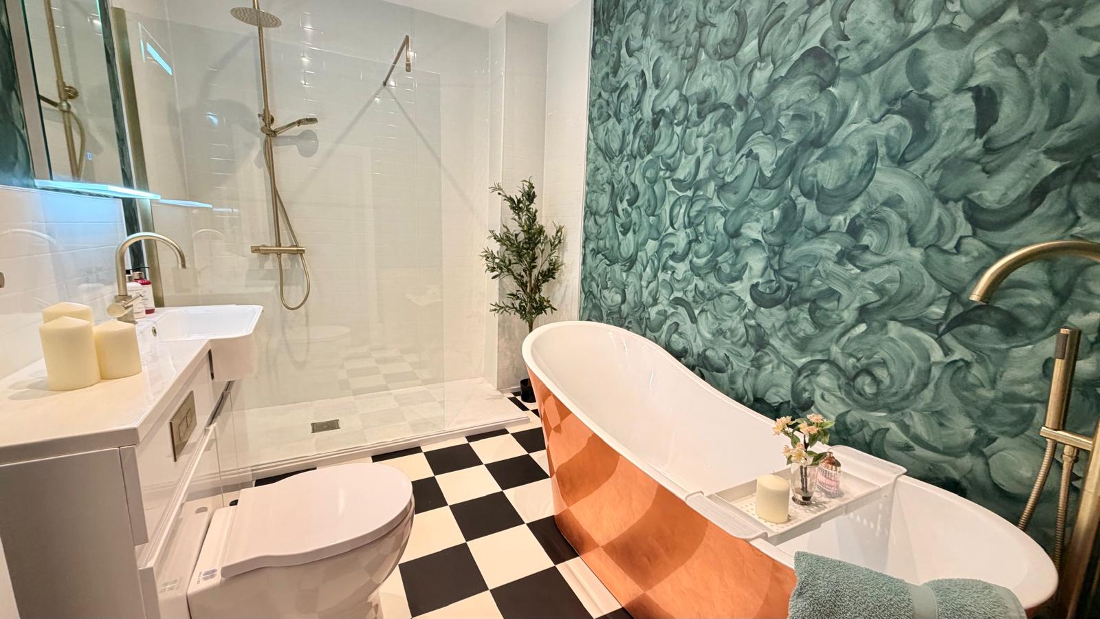 A beautiful, recently installed white suite comprising; Period free standing double ended Copper slipper bath with telephone style taps and shower attachment, wash stand with basin and cupboard, low level wc, separate walk in double length shower cubicle with low profile tray and overhead rain shower, Metro tiled splashbacks, smart mirror, feature tiled flooring and attractive gold fittings.