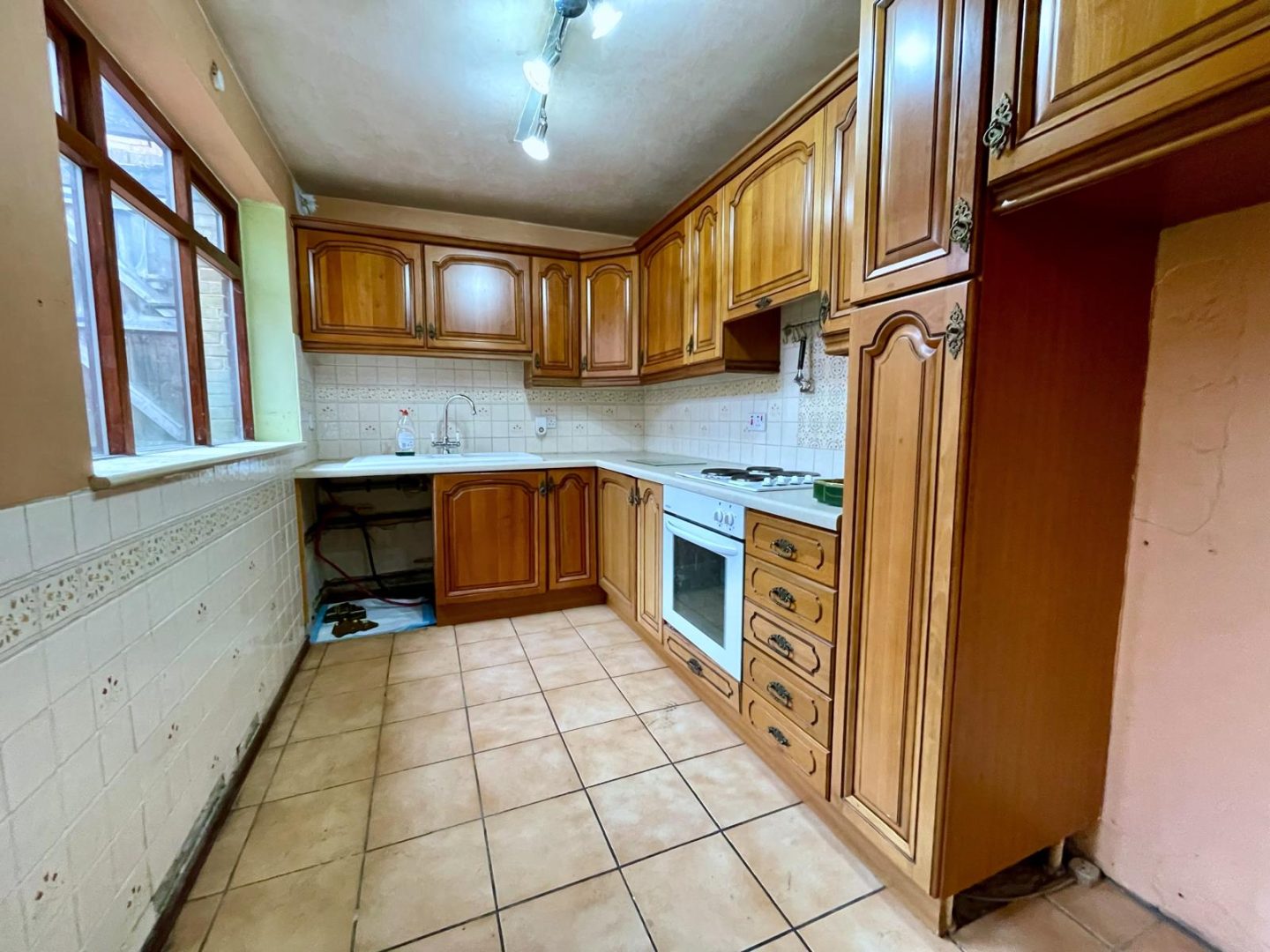 Fitted with a range of wall and base units incorporating laminated working surfaces and tiled splash backs. White fan assisted electric oven with induction hob and cooker hood over, white ceramic sink unit with mixer tap and plumbing for an automatic washing machine. Understairs storage cupboard, ceramic tiled flooring, wooden window to side and uPVC entrance door to side.