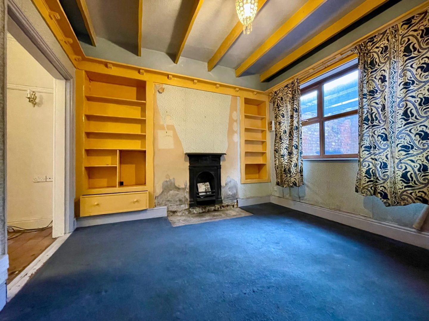 uPVC double glazed window to rear, radiator, open beams and picture rail, inset alcove shelf storage and original cast iron open fire.