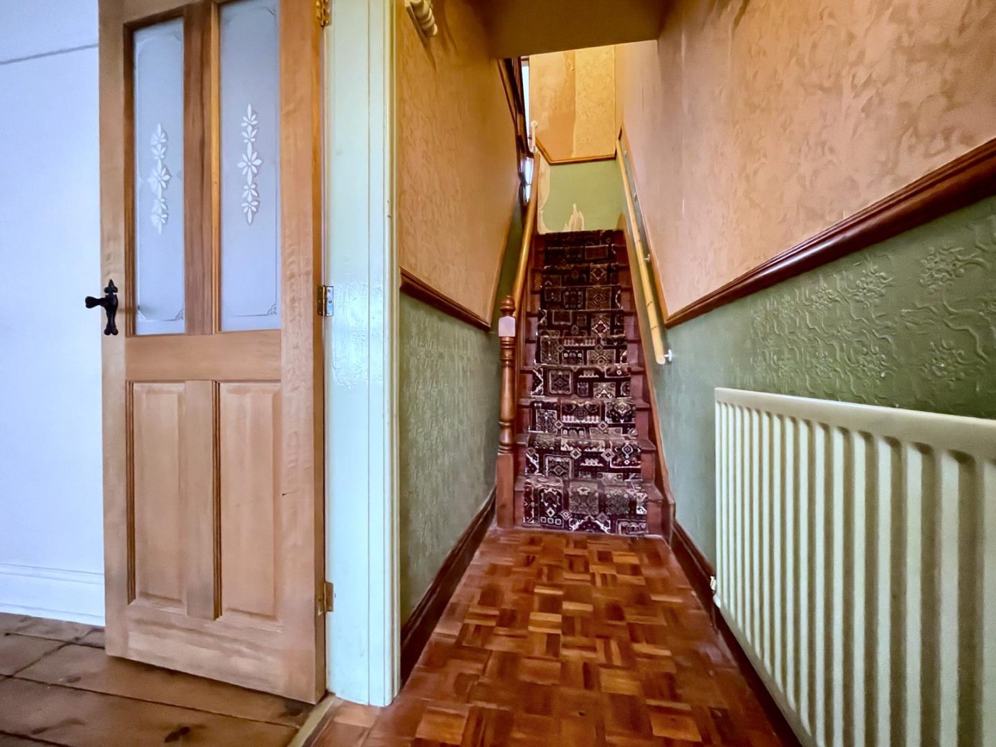 Staircase to first floor, radiator, original ceiling coving and arch moulding, dado rail and feature parquet flooring.