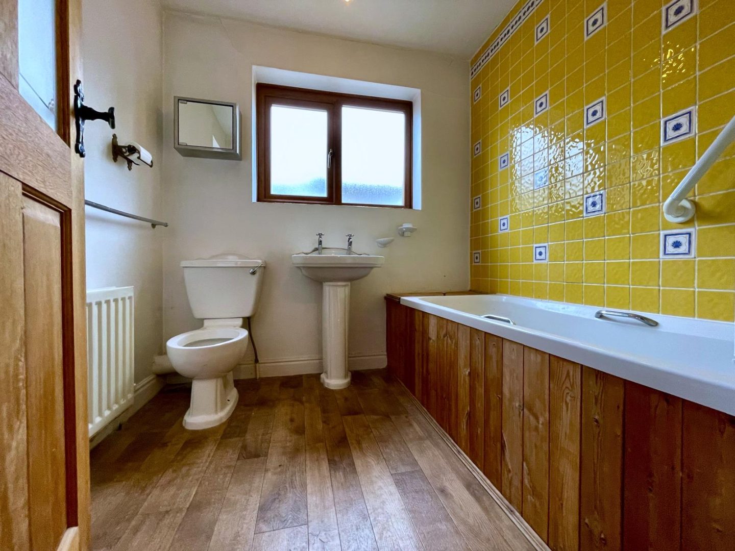 Three piece white suite comprising of a panel bath, pedestal wash hand basin and wc. Tiled splashbacks, laminated flooring, radiator and uPVC double glazed window to rear aspect.