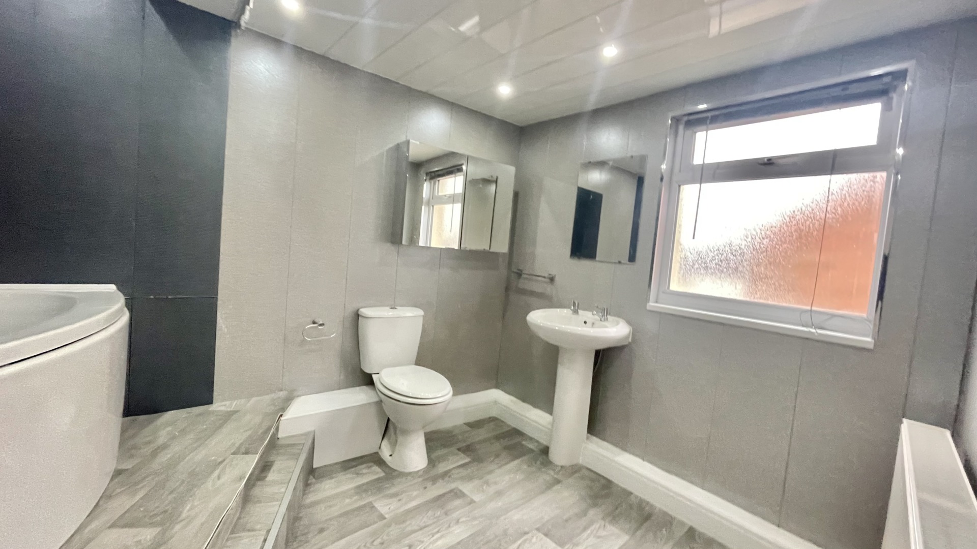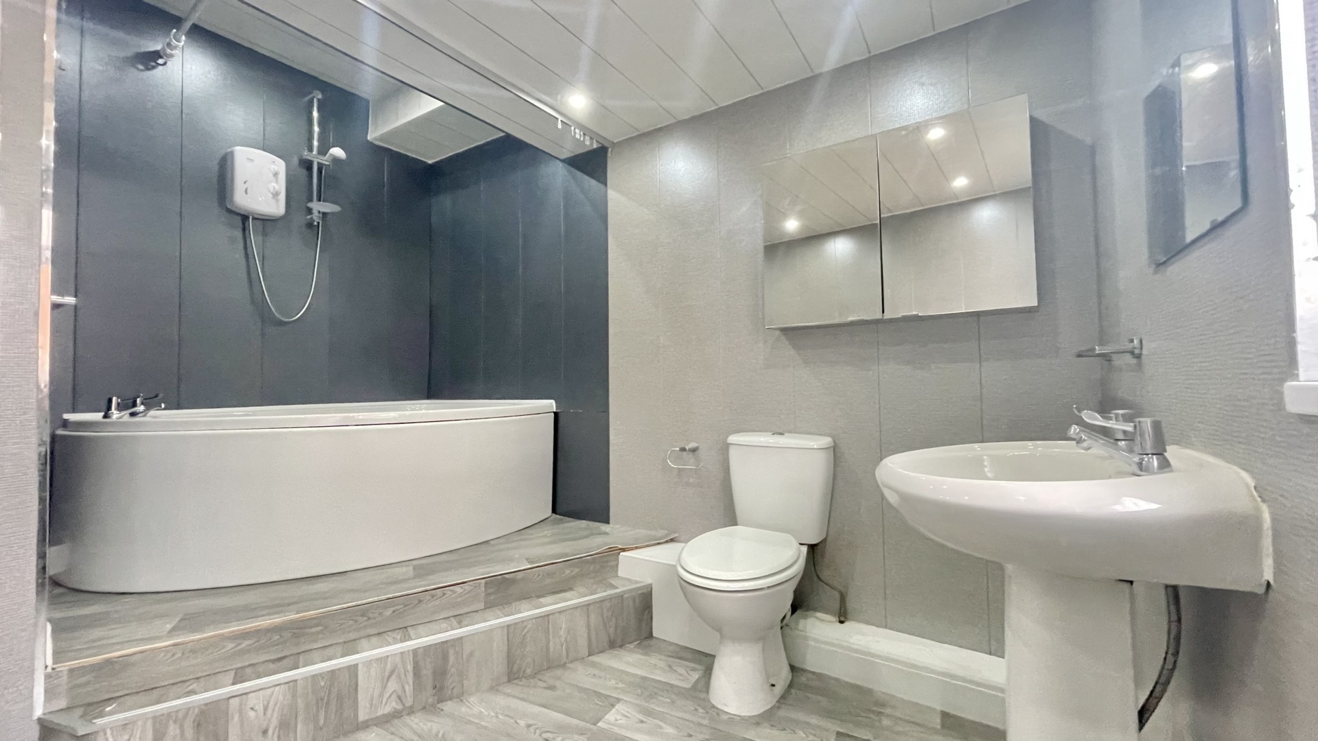 A re-fitted spacious three piece corner suite with step up to corner fitted bath with overhead electric shower, wash hand basin, low level wc, vinyl flooring, uPVC window to rear, PVC cladded walls and ceiling.