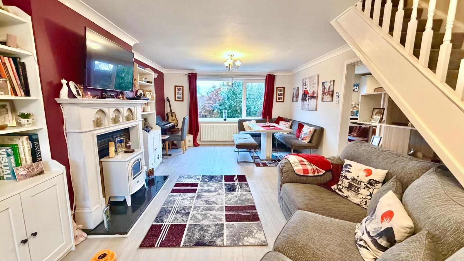 An open-plan, dual-aspect living / dining room with uPVC double glazed windows to the front & rear aspect, open staircase leading to the first floor, feature wooden fire surround with marble hearth, two radiators, laminate flooring and door to:-