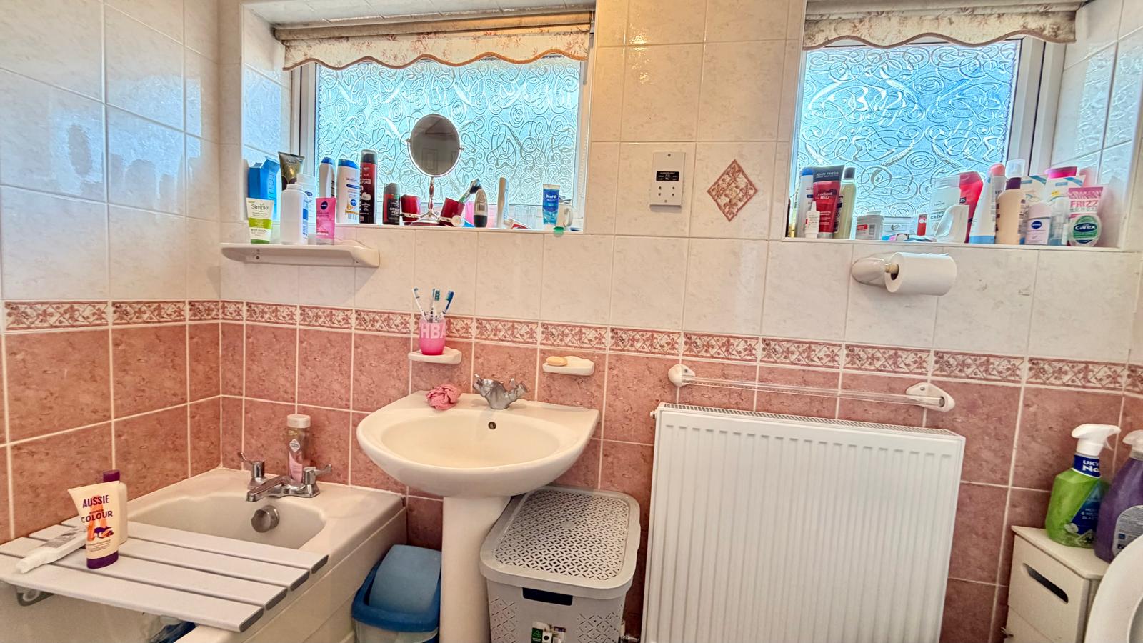 Four piece suite comprising; low level WC, pedestal wash hand basin, panelled bath, walk in separate shower cubicle with overhead shower, two double glazed windows to the side aspect, radiator, fully tiled decor.