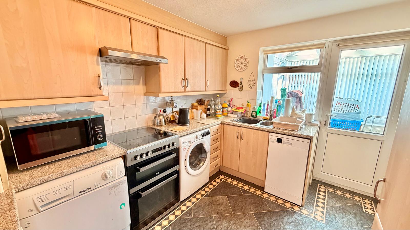 Double glazed window to the rear aspect, fitted with a range of Maple effect matching wall and base units incorporating roll top work surfaces along with a single drainer sink unit with a mixer tap over, cooker point, plumbing for an automatic washing machine, dpace for a drier, fridge & freezer, tile effect flooring, radiator and door to rear sun lounge.